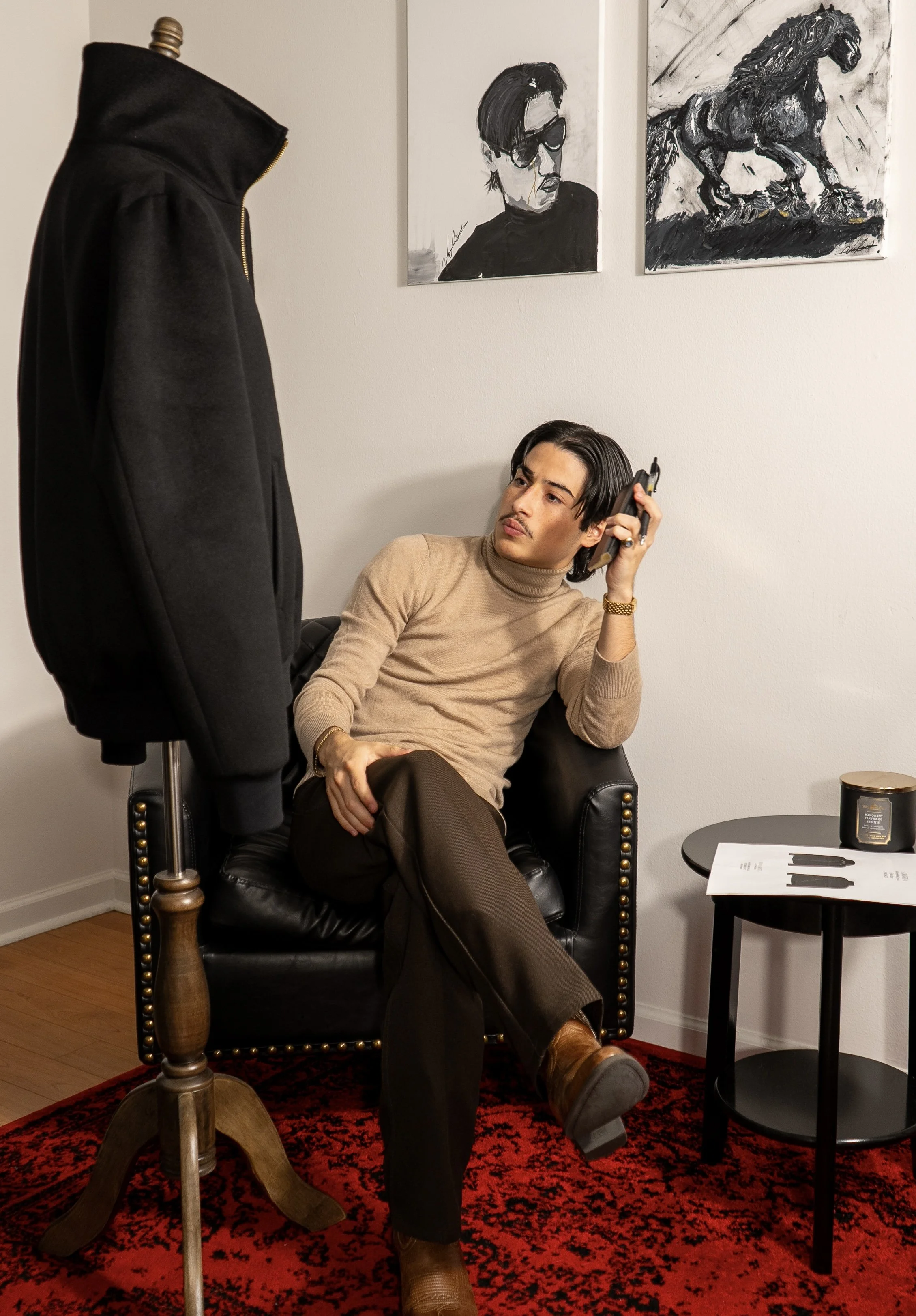 Vito Akosta examines the wool cashmere jacket that will mark the debut of his highly anticipated collection. Crafted with meticulous care by Italian artisans, the jacket represents the fusion of timeless elegance and modern design. As Akosta prepares for its release later this year, this moment reflects his dedication to honoring tradition while carving a new path in fashion. Each stitch and detail is a testament to the artisans’ mastery and Akosta’s vision—an embodiment of quality, sophistication, and the promise of something extraordinary.